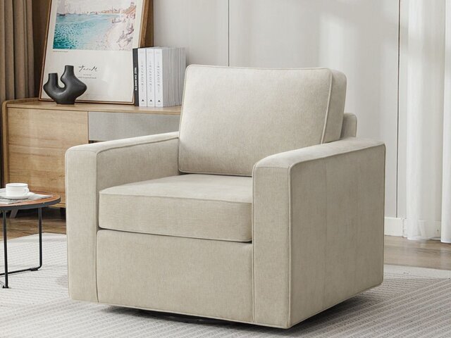 A favorite, the seat height and depth of Skyler is designed to accommodate a range of sizes with great support and comfort. This smaller scale makes it easy for this versatile chair to fit your floor plan. Square arms. Swivel mechanism allows the chair to turn a full 360°. Loose Back and fixed seat cushion. Classic box-style back cushions for a traditional look. Masterfully designed